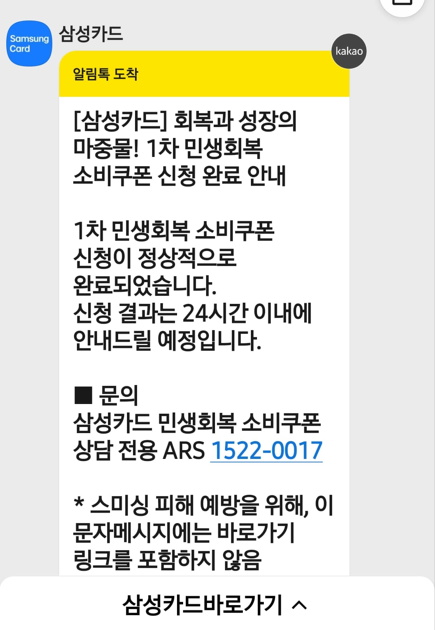 신청이 완료되고 나니 삼성카드에서 톡으로 알림을 보내줍니다.