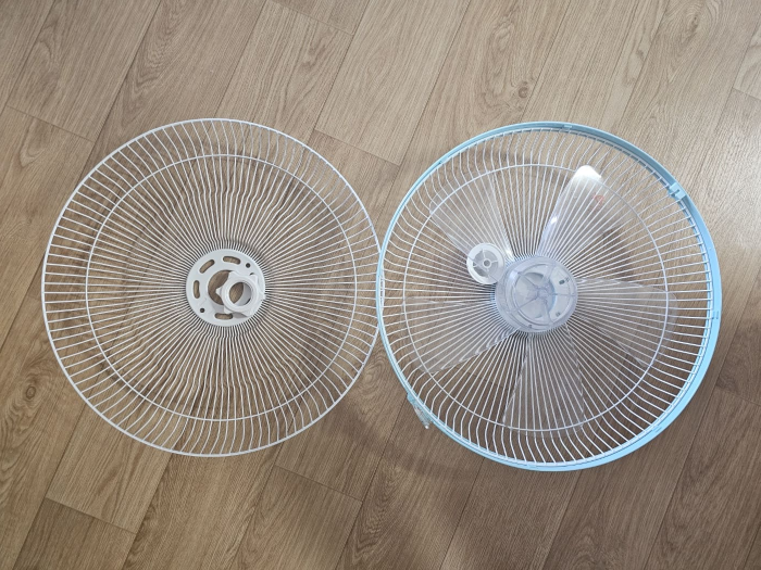 먼저 선풍기의 아랫부분에 앞망과 뒷망을 고정하고 있는 나사먼저 풀어줍니다. 그리고 앞망을 분리해 빼내고 날개를 분리합니다.