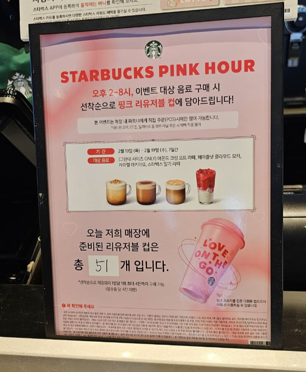 스타벅스에서 발렌타인데이를 맞아 특별한 '핑크 리유저블 컵' 증정 이벤트를 진행하고 있습니다. 이 이벤트는 2월 13일(목)부터 2월 19일(수)까지 일주일간 진행되는데요 핑크 핑크 한 것이 아주 사랑스럽네요. 하루에 45개 한정이라는데 저도 참여해 보았습니다. 그럼 어떻게 하면 받을 수 있는지 알아볼게요.