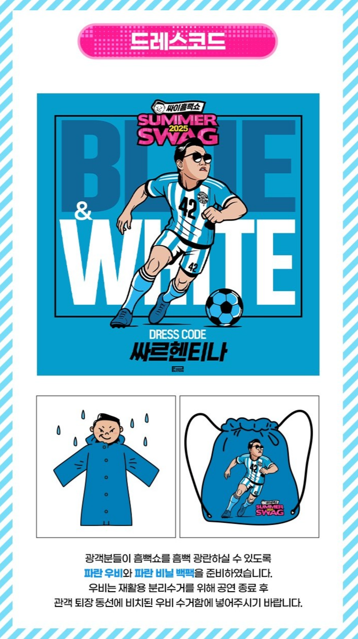 매년 싸이 흠뻑쇼는 드레스 코드를 맞춰 입장을 합니다. 올해 공연의 드레스 코드블루&화이트입니다.