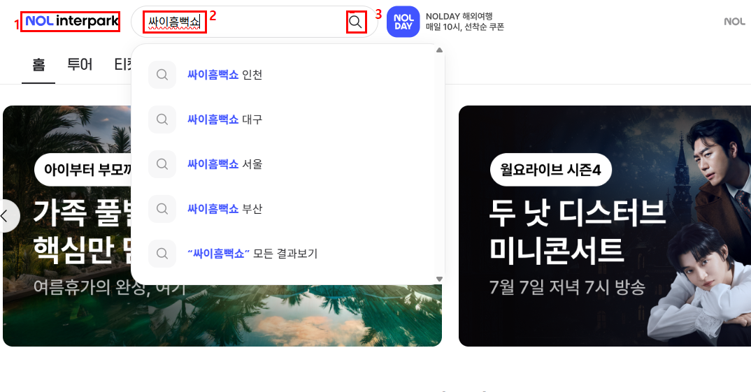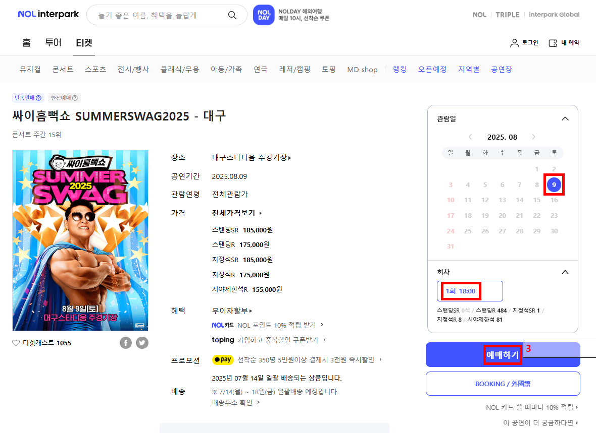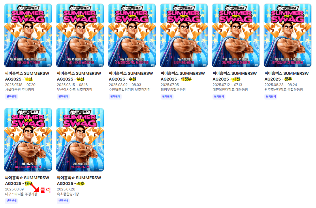 NOL 홈페이지 접속 → 싸이 흠뻑쇼  돋보기(검색) 하여 관람하고자 하는 지역을 선택하시면 됩니다.