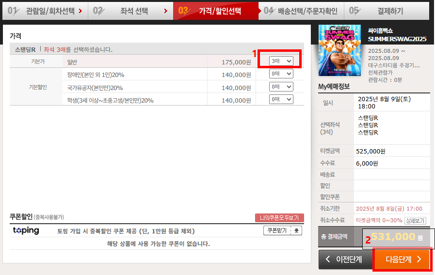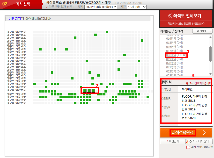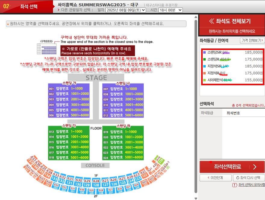 광주, 대전, 수원, 과천은 3 분류로 스탠딩 SR,  스탠딩 R, 지정석 SR가 있으며 의정부, 속초, 부산은 스탠딩 SR,  스탠딩 R, 지정석 SR, 지정석 R 4 분류로 되어 있고 대구만 시야제한석으로 5 분류로 되어있습니다.