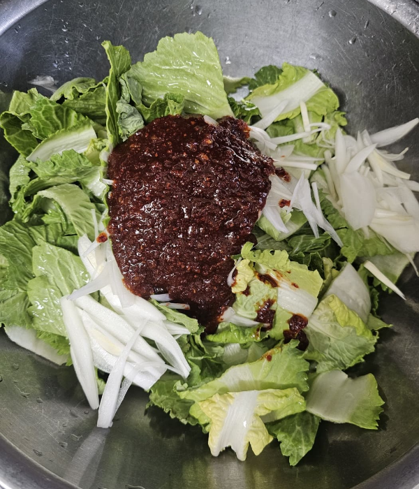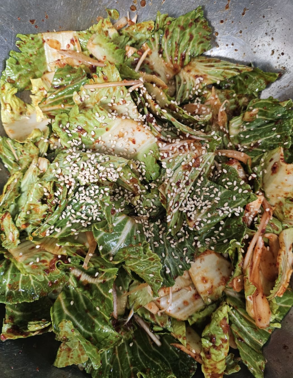 이렇게 맛있게 만들어진 봄동겉절이는 금방 지은 밥과 함께 먹으면 꿀맛이랍니다. 가위로 듬성듬성 잘라 밥을 비벼 먹어도 한 끼 뚝딱!