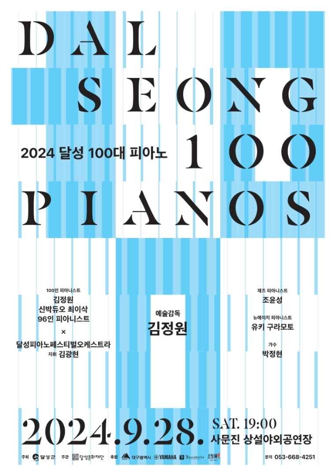 대구 달성 문화재단은 4년제 음악대학을 기준으로 재학생이나 졸업생의 피아노 전공자를 공개모집하여 100인의 피아니스트와 음악감독님, 유명 피아니스트, 대중가수들의 공연을 진행합니다.