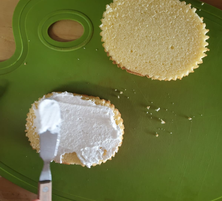 - 다 만들어졌다면 빵 바깥쪽으로 생크림을 다 발라주세요. 이때 버터나이프를 이용하시면 편해요.
