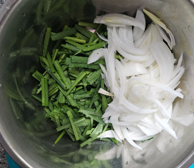 오이소박이 만들고 부추가 남았는데요 양파를 한 개 더 채 썰고 양념을 더 만들어 부추 겉절이까지 완성해 버렸습니다.