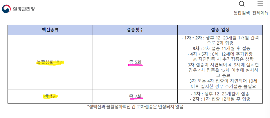 - 불활성화 백신 기준(사백신): 총 5회 접종 (생후 12–23개월 1·2차, 이후 3차, 만 6세, 만 12세)
