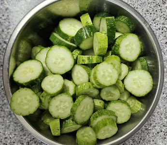 TIP: 오이는 식감이 살아있도록 너무 얇지 않게 약 0.5cm 정도의 두께로 썰어주세요.