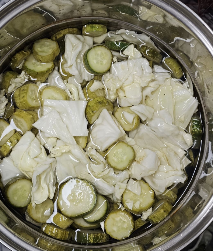 초록초록하던 오이가 피클의 색감을 띄기 시작했어요.