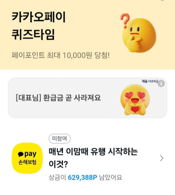 오늘 카카오페이 퀴즈가 열렸네요. 오늘은 페이손해보험 관련문제가 되겠네요.