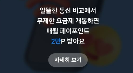 문제 & 정답 : 알뜰한 통신비교에서 무제한 요금제 개통하면 매월 페이포인트 2만 P 받아요.
