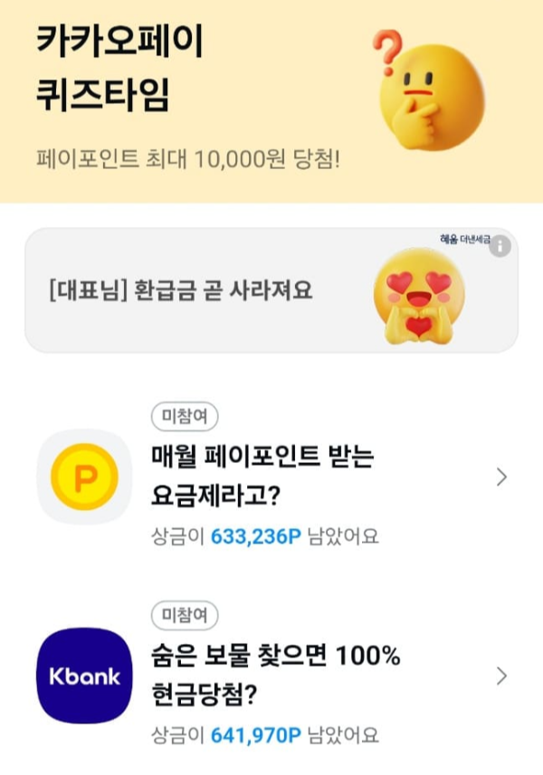 오늘의 카카오페이 퀴즈가 열렸네요. 지금 시각으로 2개의 퀴즈가 열렸네요.