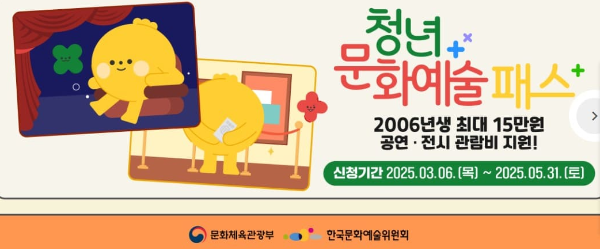 청년문화예술패스를 통해 다양한 문화예술을 경험하며 풍부한 청년 시절을 보내시길 바랍니다.