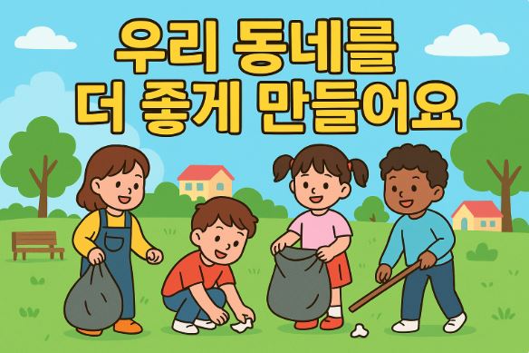 오늘부터 우리 동네를 한 번 둘러보세요. 깨끗한 곳은 더 아끼고, 부족한 곳은 어떻게 바꿀 수 있을지 생각해 봐요. 여러분의 작은 손길이 우리 동네를 멋지게 바꿀 수 있답니다!