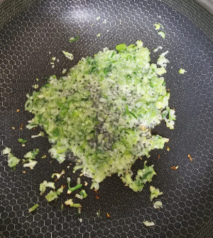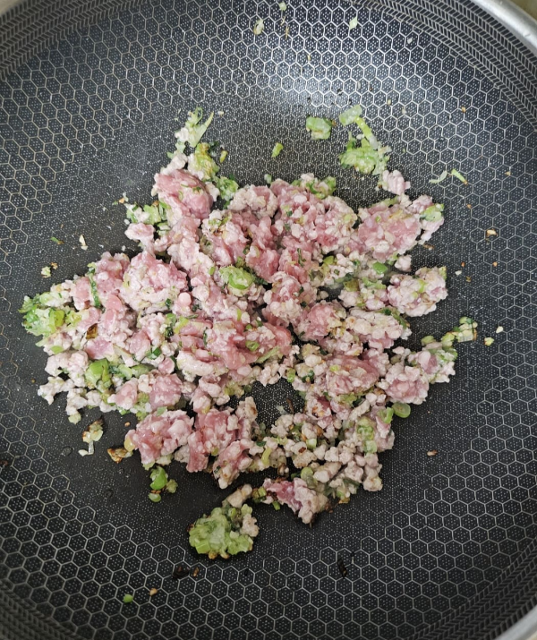 팬에 식용유를 두르고 다진 마늘과 대파를 볶아 향을 내고 다진 돼지고기를 넣고 중불에서 익을 때까지 볶는다.
