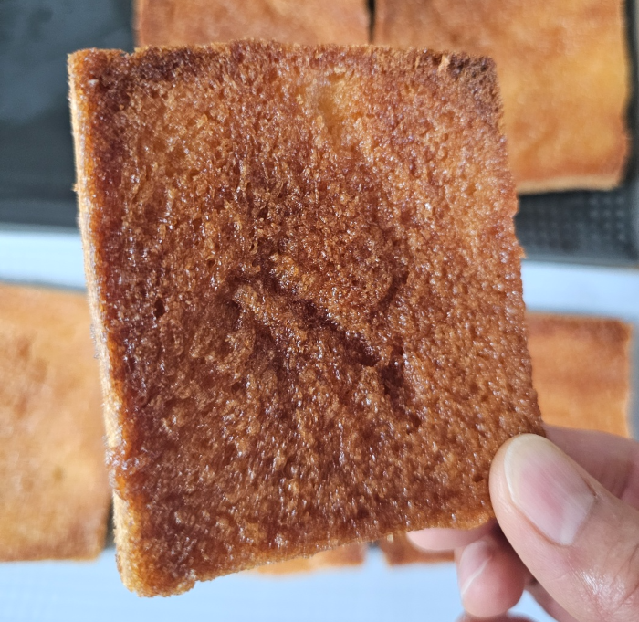 6. 약간 탄듯한 정도의 색상이 나오면 잘 구워진 거랍니다. 앞뒤로 잘 구워졌다면 접시에 겹치지 않도록 놓고 냉장고에 5분 또는 실온에 10분 정도 그대로 식혀두면 바삭하게 됩니다.