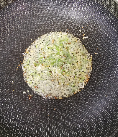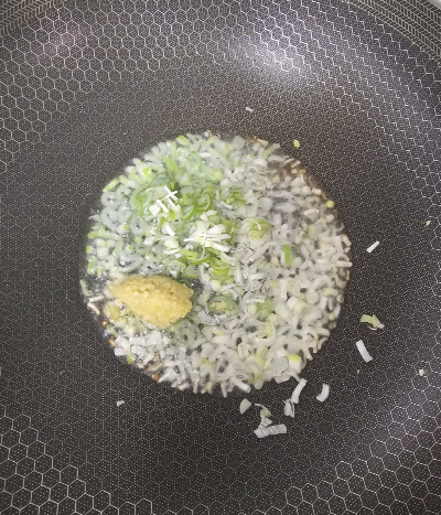 팬에 식용유를 넉넉히, 다진 마늘과 대파를 넣어 센 불에서 1분 정도 살짝 볶아주세요.