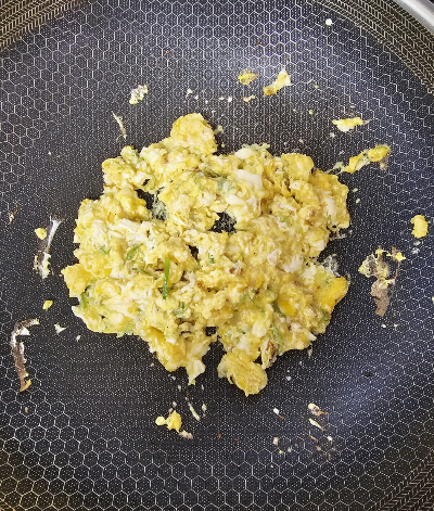 대파와 마늘이 노릇해지기 시작하면서 향이 올라오면 불을 줄이고 계란 4개를 넣고 저어가며 스크램블을 만들어 주세요. 이때 후추를 조금 넣고 소금을 한 꼬집 정도 넣어줍니다.