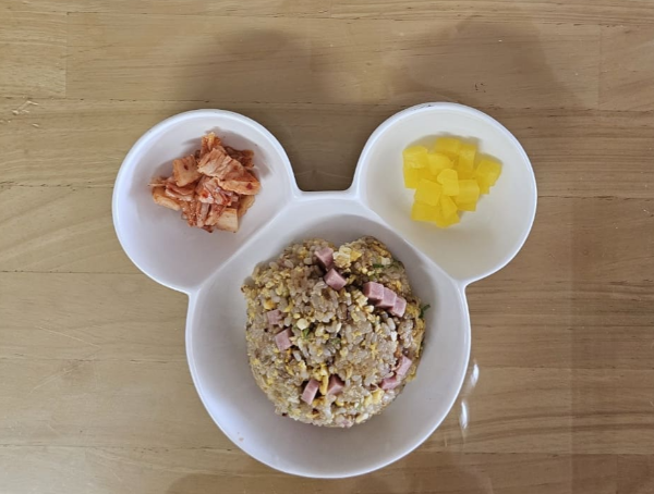 예쁘게 접시에 담아주세요. 전 이런 볶음밥류를 아이들에게 줄 때 곰돌이 모양 접시를 잘 사용하는데요 이 접시가 은근 맞춤이에요.