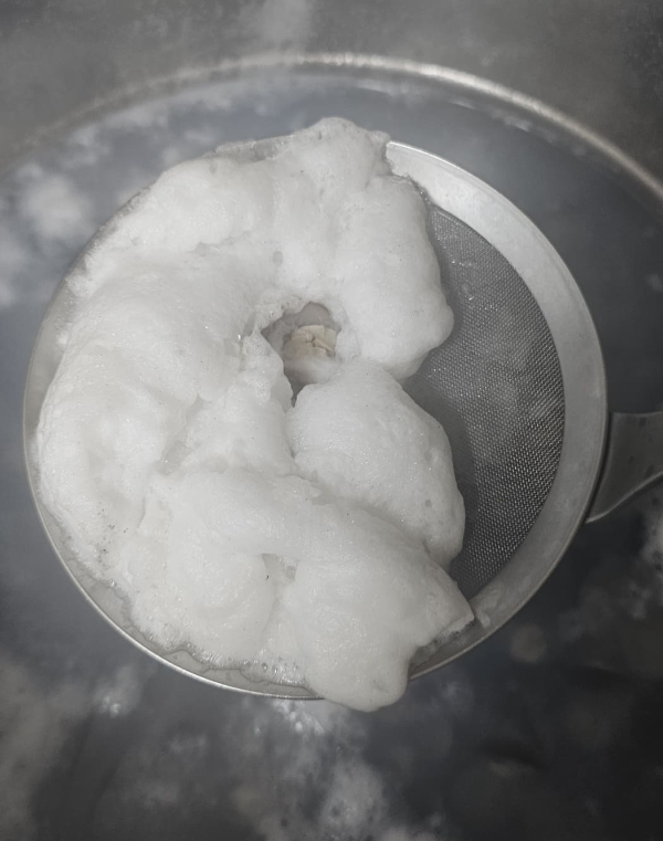 깨끗이 씻었는데도 삶고 나니 이렇게 찌꺼기가 있네요. 이렇게 걸러주어야 국을 먹을 때 씹히는 모래나 찌꺼기가 없어요.