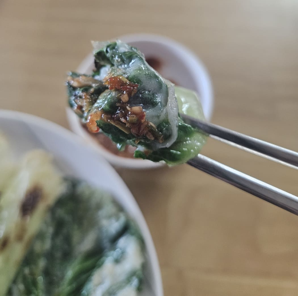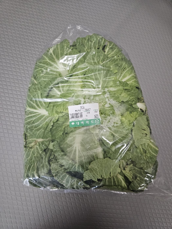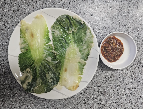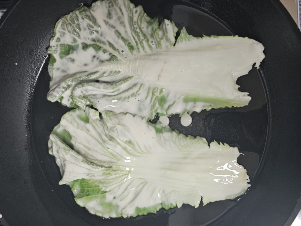 그리고 봄동은 겨울을 지나면서 서리가 맞아 더욱 단맛이 깊은 특징이 있어요. 생으로 먹어도 맛있지만, 전으로 부치면 고소함이 배가 되니 안 먹을 수 없겠죠. 마트에서 사 온 봄동으로 겉잎 몇 장을 구워볼게요.