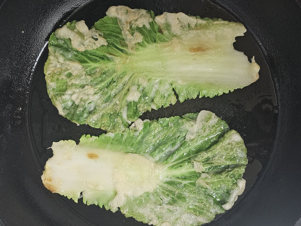 달궈진 팬에 기름을 적당히 두르고, 반죽 입힌 봄동을 올려 앞뒤로 노릇하게 부쳐줍니다. 중약불에서 앞뒤로 바삭하게 익혀주세요.