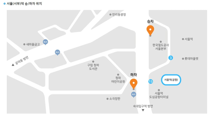 서울역에서 기차에서 내려 밖으로 나와서 왼쪽 방향의 3번 출구로 나와서 계단을 내려와 오른쪽으로 약 100m 정도 가면 셔틀버스정류장이 있습니다. 처음엔 나가는 방향 출구를 제대로 보지 않아 반대방향으로 나가서 엄청 헤맸던 기억이 나네요.
