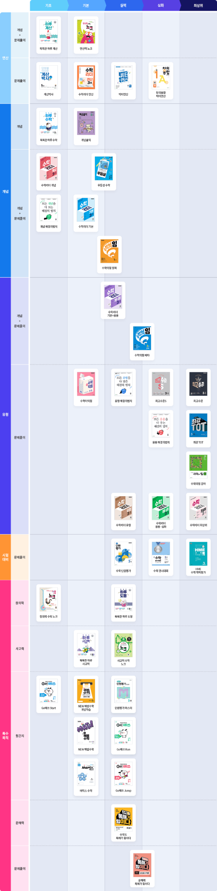 아이에게 딱 맞는 문제집을 골라 꾸준한 학습으로 이어지도록 하여 수학에 자신감을 높이도록 도움을 주세요!