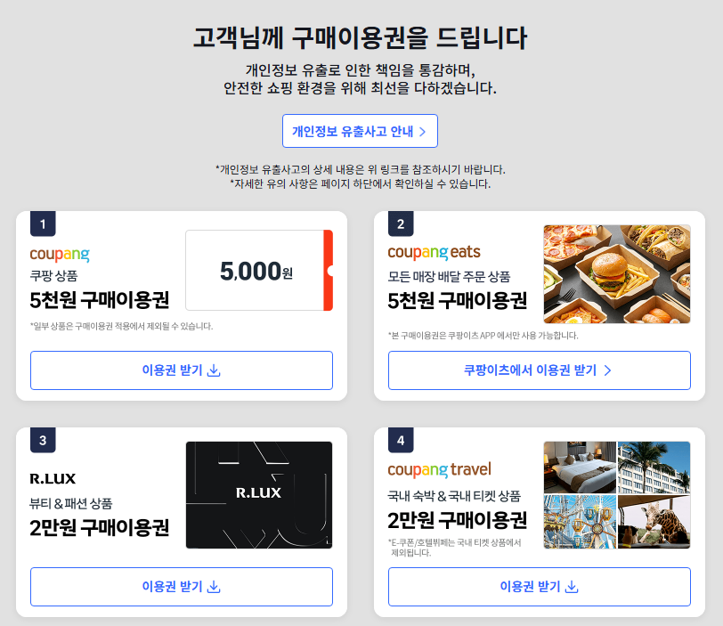 - 쿠팡 고객센터(☎️ 1577-7011)로 문의하면, 본인의 보상 대상 여부 및 쿠폰 관련 정보를 확인할 수 있습니다.