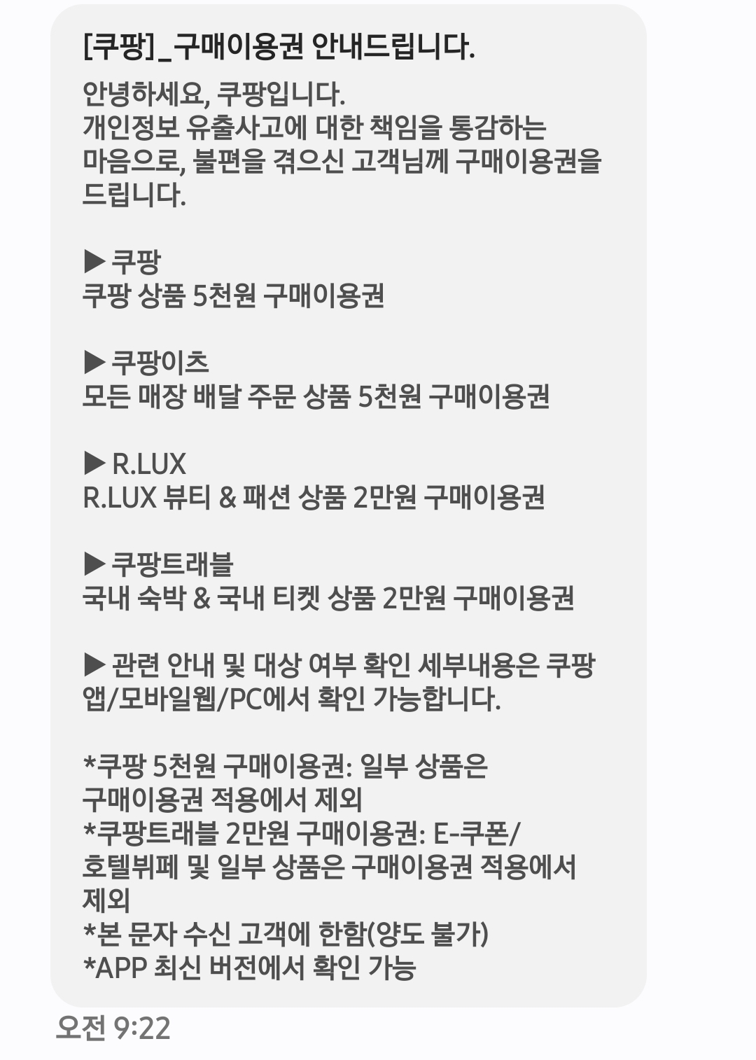 쿠팡에서 직접 "개인정보 유출 관련 안내" 문자나 메일을 받으신 분만 보상 대상입니다.