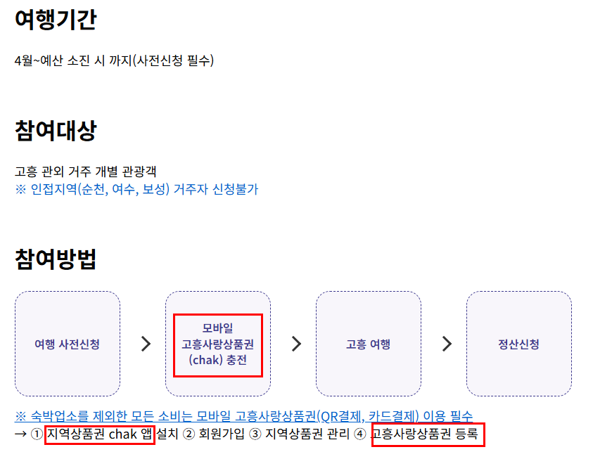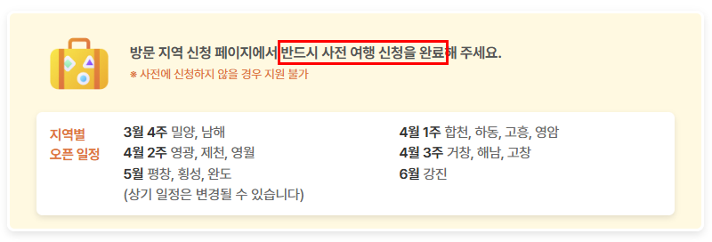 ※ 각 지역별로 지정된 관광지 방문을 조건으로 하는 곳이 많으니 사전신청시 꼭 지자체 홈페이지를 확인하여야 합니다.