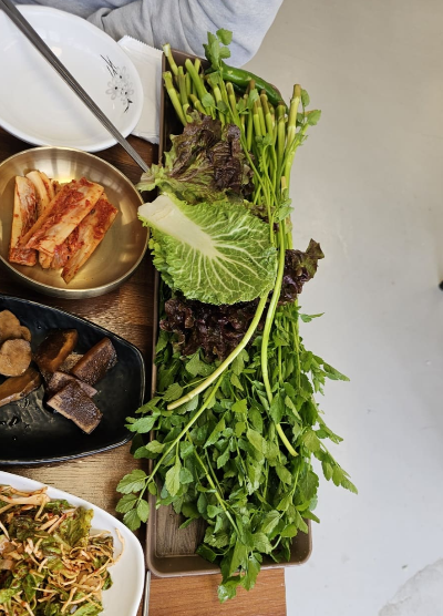 요즘 야채값이 비싸서 고깃집에 야채 많이 안 주시는데 여긴 야채 엄청 많이 주셔서 맛나게 정말 열심히 먹었습니다. 미나리 향도 많이 나고 부드러워 계속 들어갑니다. 밑반찬으로 나오는 고사리와 장아찌, 재래기가 맛이 좋아요.