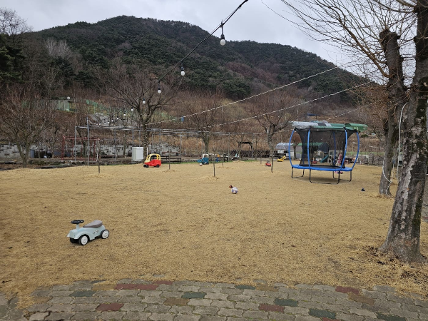 비 오는 추운 날이라 마당에는 아무도 없이 텅 비었네요. 아이들이 뛰어놀기 충분한 사이즈의 마당과 트램펄린, 다양한 장난감자동차들이 있었습니다.
