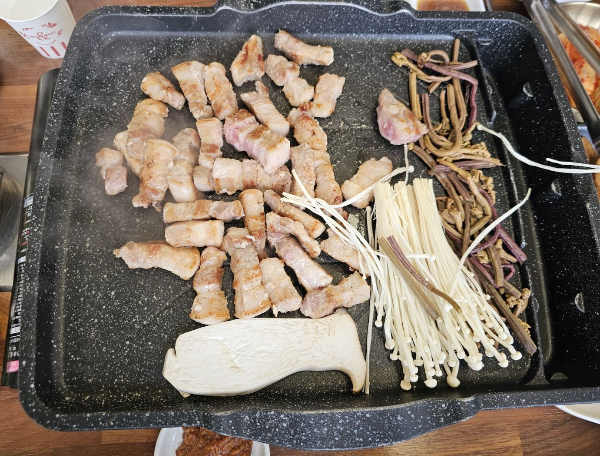 삼겹살은 지금 불판 위에 있는 저 양이 4인분으로 양이 조금 아쉬웠어요. 근데 고기는 정말 맛있네요. 두께감도 적당하고 초벌이 되어있어 육즙도 있고 맛있게 먹었네요.