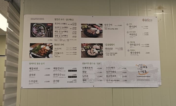 메뉴를 살펴보면 오리, 닭백숙을 비롯해 소와 돼지 구이류가 있고 해물파전 및 칼국수등이 있어요.