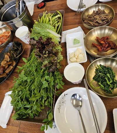요즘 야채값이 비싸서 고깃집에 야채 많이 안 주시는데 여긴 야채 엄청 많이 주셔서 맛나게 정말 열심히 먹었습니다. 미나리 향도 많이 나고 부드러워 계속 들어갑니다. 밑반찬으로 나오는 고사리와 장아찌, 재래기가 맛이 좋아요.
