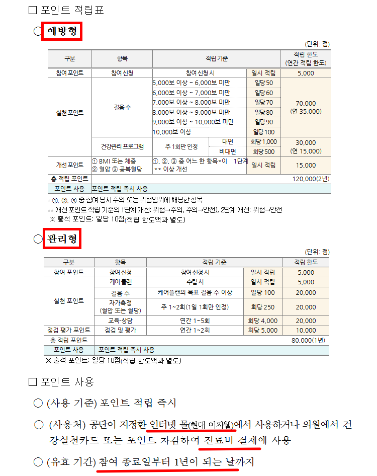 - 건강 교육 이수, 생활관리 프로그램 이수 등으로 추가 포인트 획득 가능