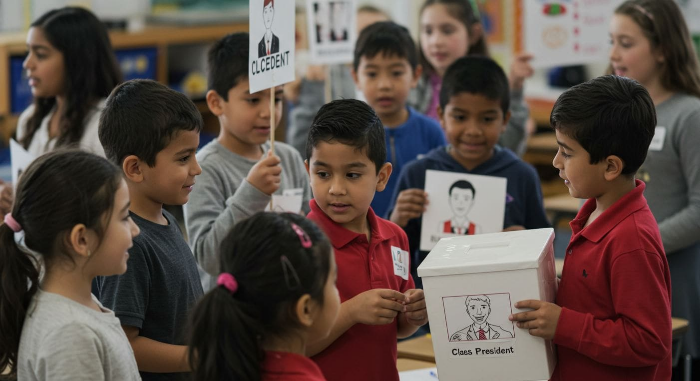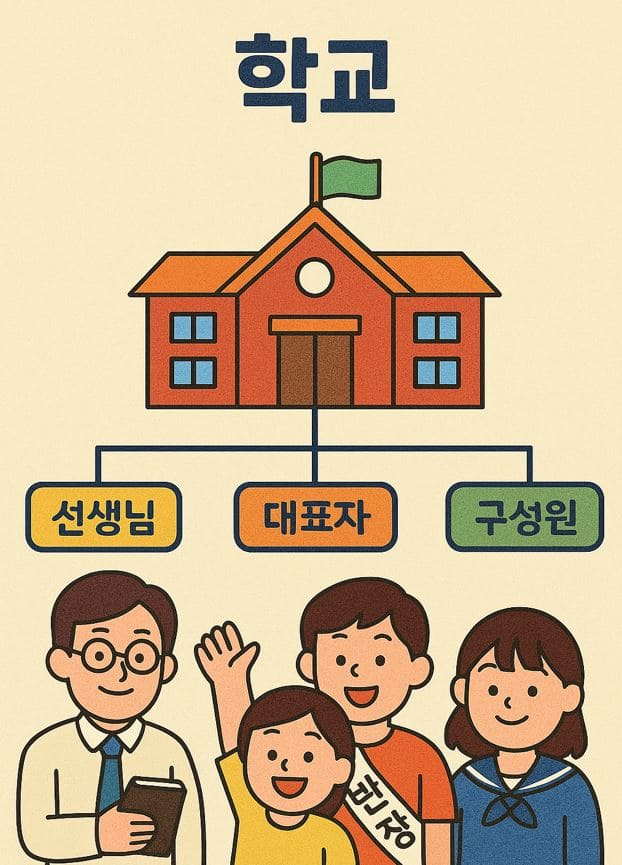 학교도 마찬가지예요. 선생님은 지도자, 반장은 대표자, 친구들은 구성원이에요. 서로 다른 역할을 가지고 함께 생활하죠.