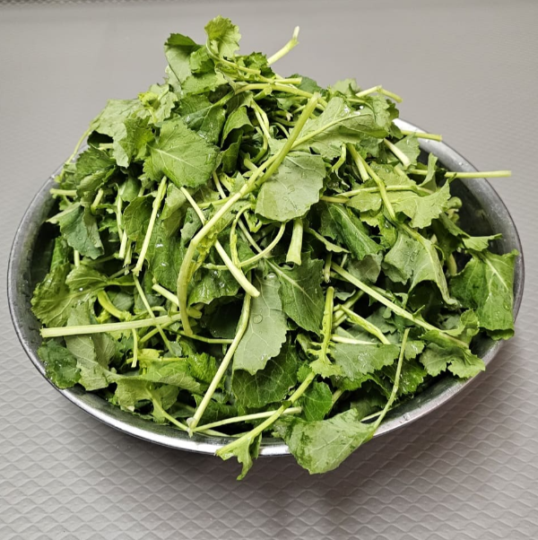 시장에 갔더니 유채나물이 많이 나왔길래 생각이 나서 겉절이를 담아볼까 싶어 5천 원어치 사 왔습니다. 5천 원어치가 정말 많네요. 큰 볼에 가득입니다. 무게를 재어보니 약 1kg 정도 되네요.