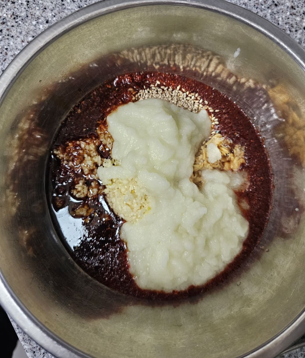 고춧가루, 다진 마늘, 액젓, 새우젓, 매실청, 통깨, 간 양파를 섞어 양념장을 만듭니다.