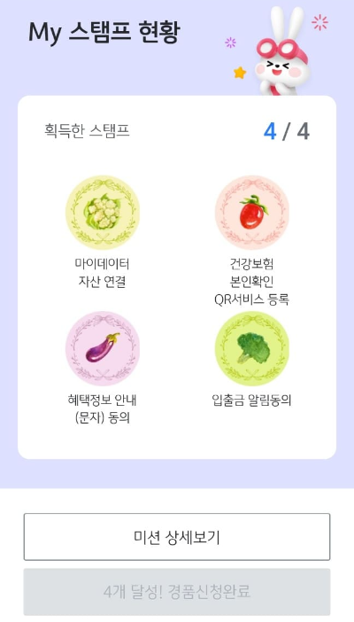 3. 4가지 미션을 완료하면 응모가 됩니다. 국민은행 앱을 사용 중이라 그런지 미션이 자동으로 다 되어 버렸네요.