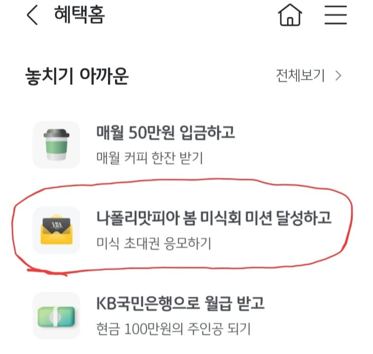 1. 국민은행 앱을 접속하여 하단 혜택 부분을 눌러 아래로 스크롤하면 해당 이벤트가 나옵니다.