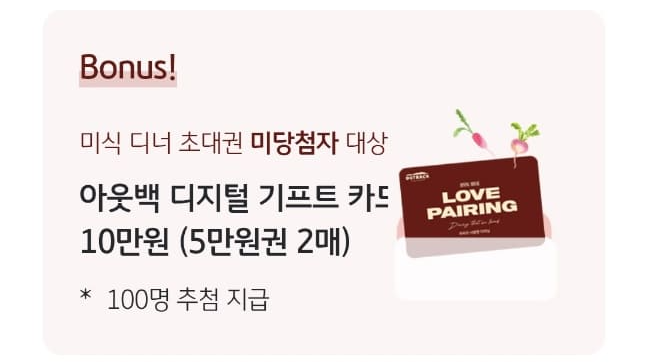 미당첨자를 대상으로 아웃백 디지털기프트카드 10만원(5만원권 2매)을 100분에게 추첨하여 지급합니다.