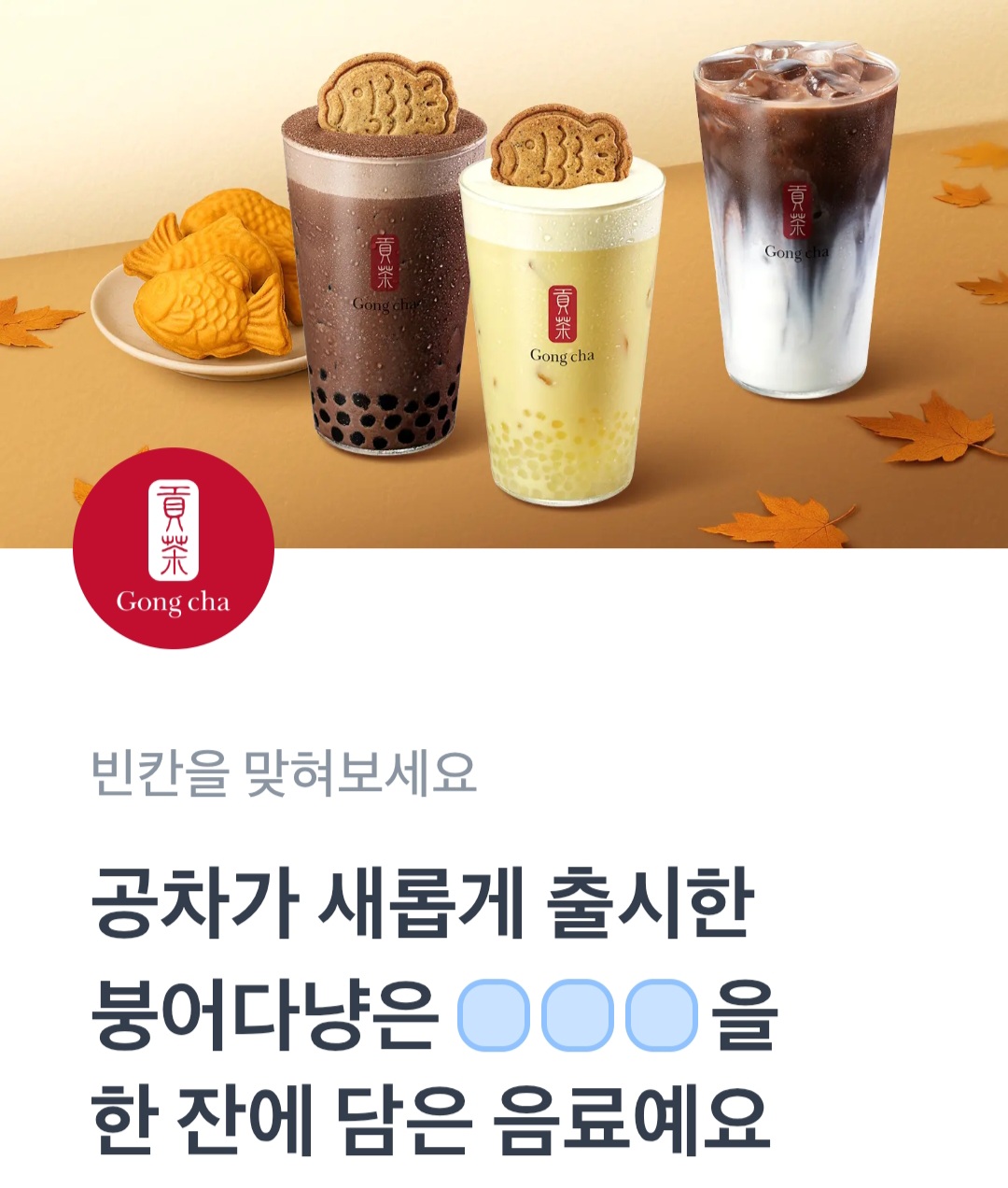문제 : 공차가 새롭게 출시한 붕어다냥은 ㅇㅇㅇ을 한 잔에 담은 음료예요.