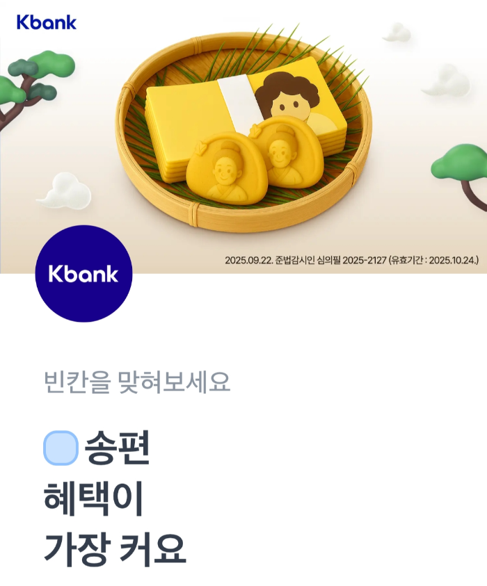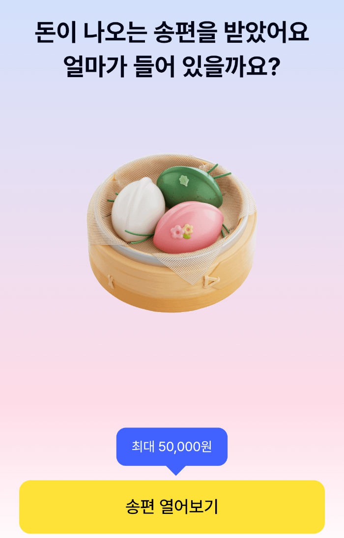 케이뱅크 2025 추석 이벤트로 송편을 누르면 최대 50,000원 랜덤 현금을 쏩니다.