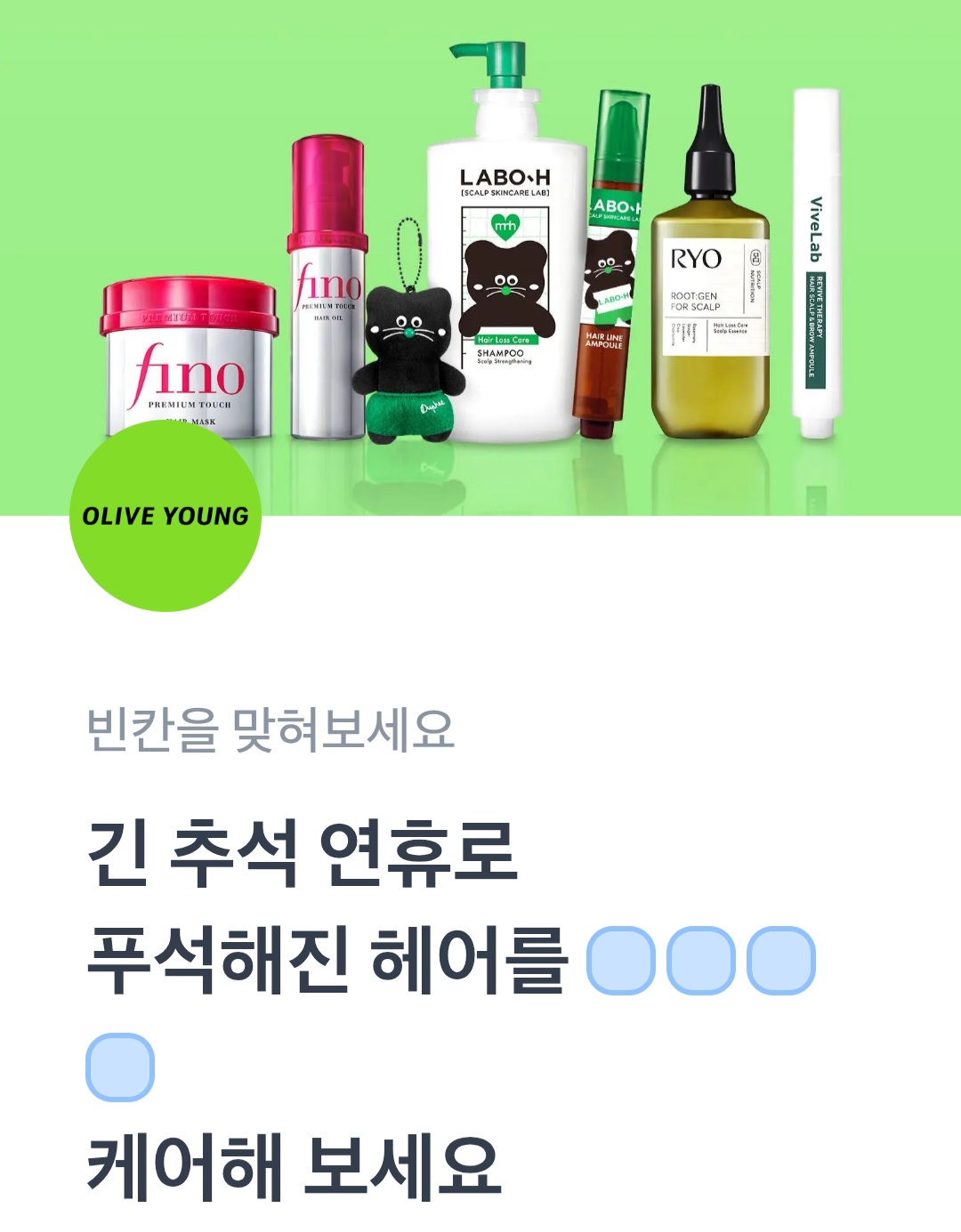 문제: 긴 추석 연휴로 푸석해진 헤어를 ㅇㅇㅇㅇ케어해 보세요