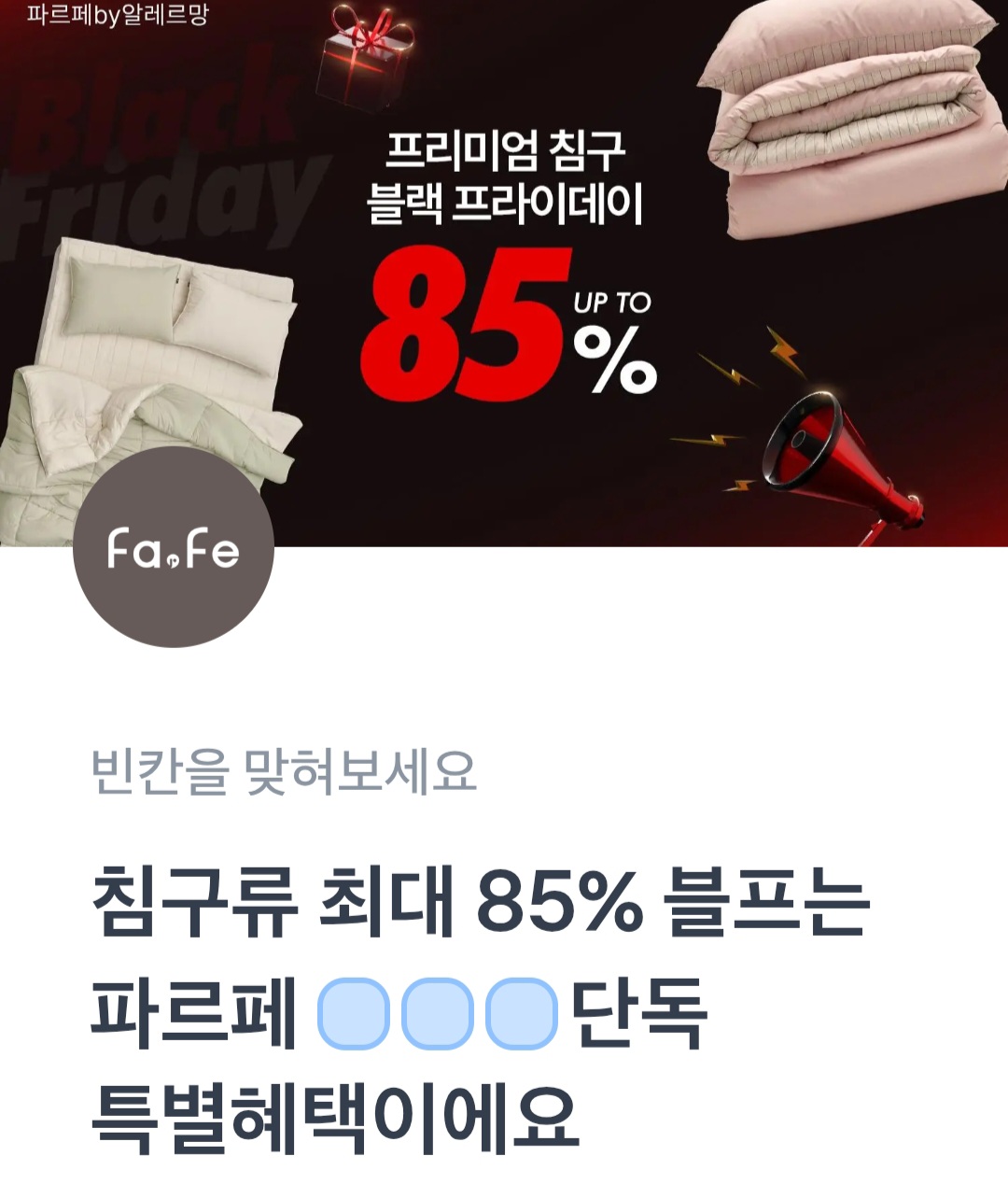 문제 : 침구류 최대 85% 블프는 파르페 ㅇㅇㅇ 단독 특별혜택이에요