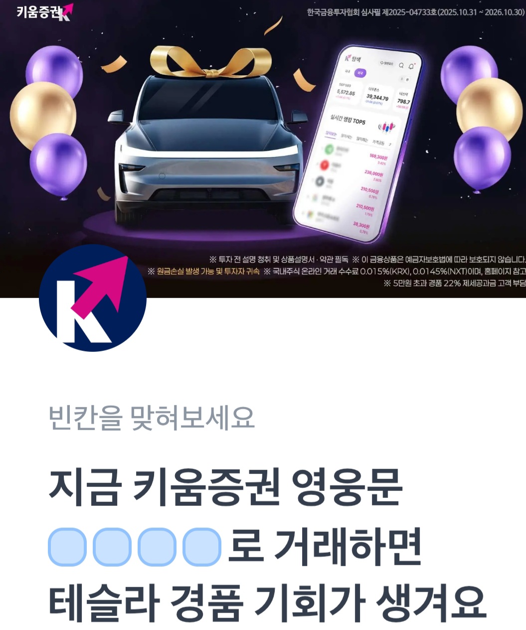 문제 : 지금 키움증권 영웅문 ㅇㅇㅇㅇ로 거래하면 테슬라 경품 기회가 생겨요