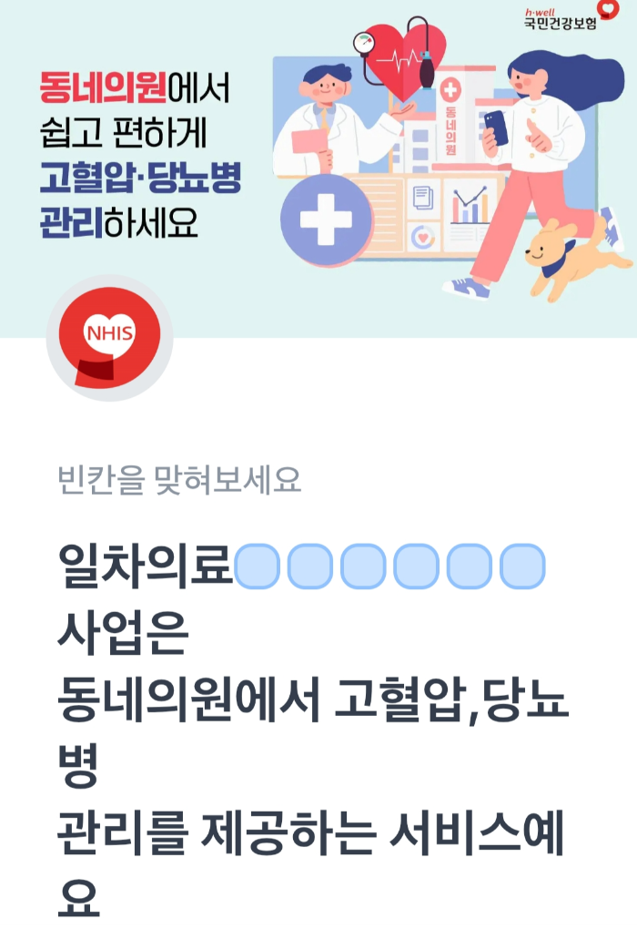문제 : 일차의료 ㅇㅇㅇㅇㅇㅇ사업은 동네의원에서 고혈압, 당뇨병 관리를 제공하는 서비스예요.