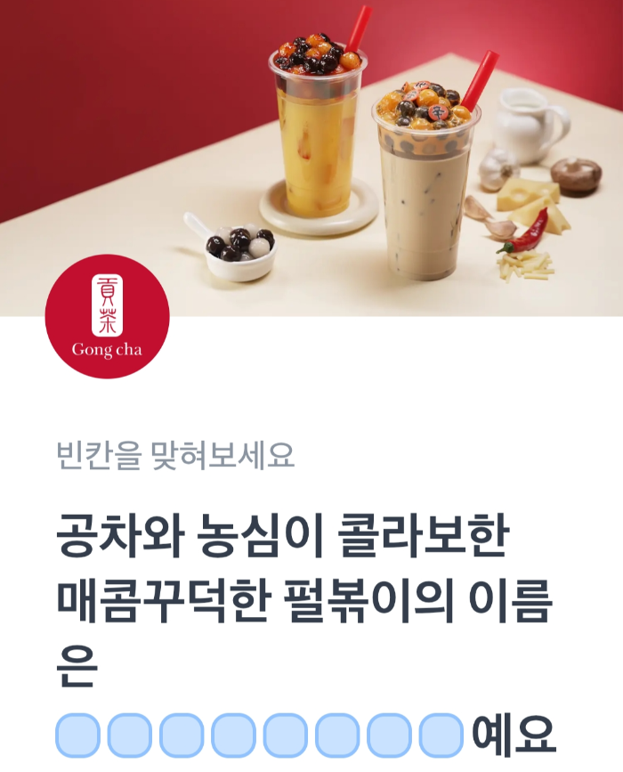 문제 : 공차와 농심이 콜라보한 매콤꾸덕한 펄볶이의 이름은 ㅇㅇㅇㅇㅇㅇㅇㅇ예요.